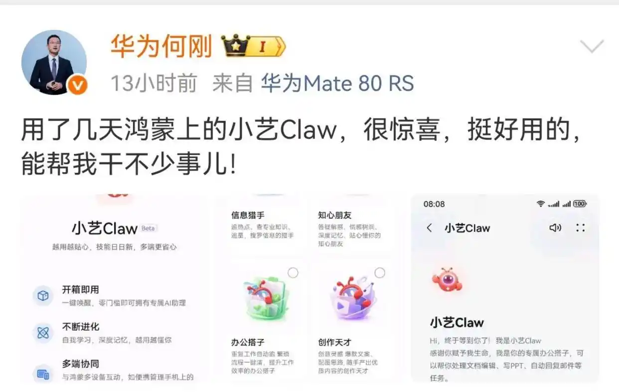 近日,华为终端BG首席执行官何刚通过社交媒体展示了运行于鸿蒙系统的新功能——小艺Claw(Beta版)。这标志着华为正式将基于OpenClaw开源框架的AI智能体(AI Agent)集成至其移动生态。