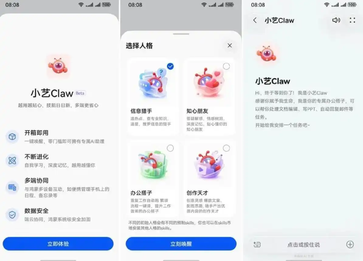 与传统的语音助手不同,小艺Claw被设计为具备“人格”与“技能”的专属助理。用户可为其选择“信息猎手”、“知心朋友”、“办公搭子”或“创作天才”四种初始身份,每种身份预置了不同的任务处理倾向,例如文档编辑、PPT制作、邮件自动回复或创意灵感激发。该智能体宣称具备自我学习与深度记忆能力,并依托鸿蒙系统实现多设备间的任务协同。