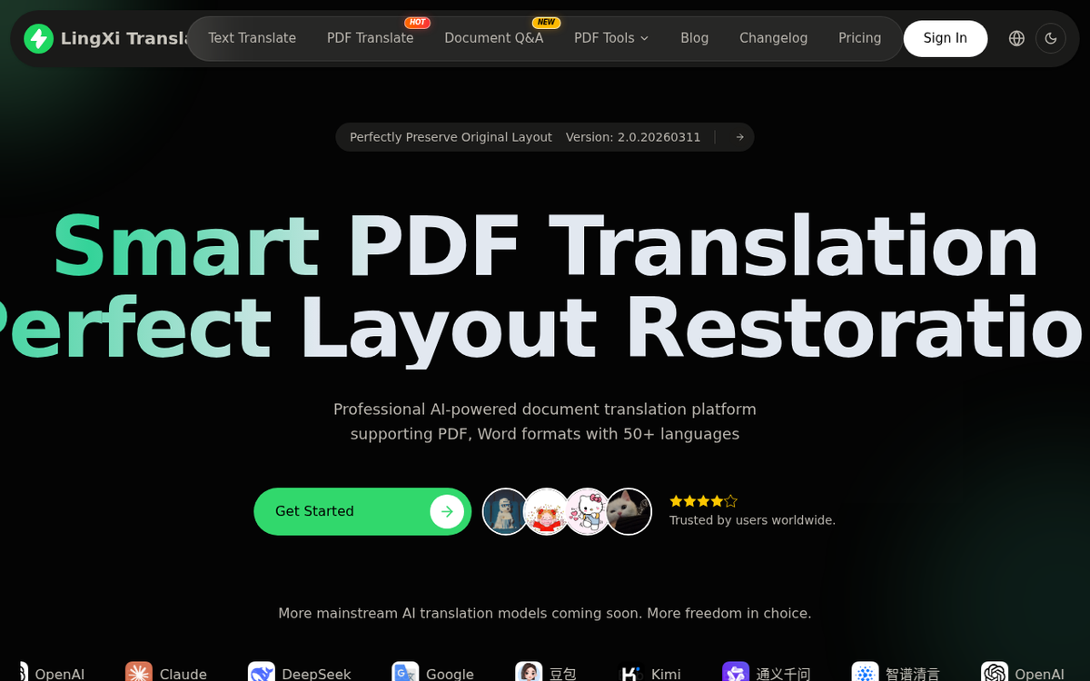 灵夕翻译是一款基于AI技术的智能文档翻译平台,专为有跨语言文档处理需求的用户设计,致力于提供高效、准确且保持原格式的文档翻译服务。平台采用先进的神经网络机器翻译技术,支持100+种语言互译,内置覆盖法律、医学、工程等20+专业领域的术语库,确保专业词汇翻译准确无误。灵夕翻译支持PDF、Word、Excel等多种主流文档格式,能自动识别并还原表格、公式、图表等复杂排版;对于扫描版PDF,智能OCR技术识别率高达99.9%,精准翻译并完美还原格式。平台提供免费试译体验,采用银行级数据加密技术,所有上传文档72小时内自动删除,确保用户隐私安全无忧。无论是学术研究、商务应用还是日常办公,灵夕翻译都能帮助用户轻松跨越语言障碍,让世界沟通更简单。
