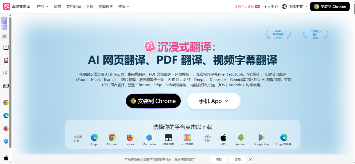 沉浸式翻译是新一代AI翻译工具,以浏览器扩展和移动应用形式提供服务,全平台已获得超1000万用户青睐 。其核心创新在于首创AI「双语对照」网页翻译样式,通过垂直对照排版将原文与译文并排展示,显著降低对原网页的“侵入性”,提升外文阅读体验 。平台集成ChatGPT、DeepL、DeepSeek、Gemini、Claude、Qwen、Kimi等多款顶尖AI翻译模型,支持100+语言互译,为用户提供精准流畅的翻译服务 。除了网页翻译,沉浸式翻译还深度支持YouTube、Netflix等视频平台的双语字幕、Zoom/Meet/Teams等会议工具的实时翻译,以及PDF、ePub电子书、图片、漫画等多种格式的双语处理,旨在帮助用户打破语言障碍,连接更广阔的世界 。