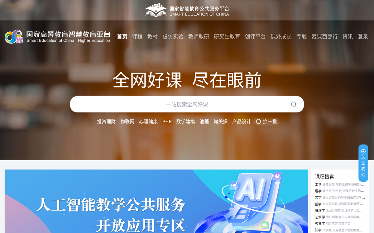 - 课程博览中心:汇聚3.1万门优质慕课(MOOC)、虚拟仿真实验教学课程、在线开放课程等多种形态的数字化资源,覆盖哲学、经济学、法学、教育学、文学、历史学、理学、工学、农学、医学、管理学、艺术学等全部12个学科门类,拥有大量由院士、长江学者、国家教学名师领衔担纲的精品课程。