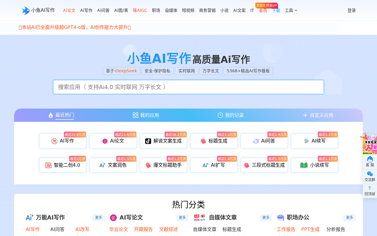 小鱼AI写作是由广州万之禾科技有限公司推出的免费在线智能AI写作平台 。平台基于百度文心一言大模型的文本续写能力,结合自主研发的深度合成服务算法,于2024年2月通过国家互联网信息办公室境内深度合成服务算法备案 。小鱼AI写作内置超过5300个精品写作模板,覆盖30余种创作场景,支持AI写作、续写、改写、扩写、润色等多种功能 。平台采用DeepSeek引擎驱动,可将2000字文章的创作时间从4小时压缩至18秒,中文优化准确率达93%,实测小红书爆款率提升42% 。无论是自媒体创作者、职场人士、学生还是电商运营,小鱼AI写作都能帮助用户快速生成高质量内容,释放创作潜能 。