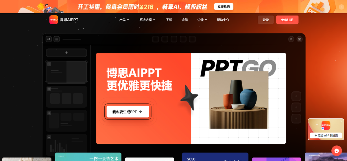 博思AIPPT(PPTGO)是深圳市博思云创科技有限公司推出的一款AI智能生成PPT工具。该公司成立于2021年,由AIGC软件A股上市公司万兴科技(300624.SZ)内部孵化,已完成多轮融资,投资方包括中金鑫智、百度风投、复星创富、金蝶等知名机构。博思云创核心创始团队在协同办公领域拥有10余年行业经验,旗下品牌还包括产品设计工具Pixso、博思白板boardmix。博思AIPPT提供AI一键生成PPT大纲、文案生成PPT、文件转PPT、智能排版和AI文本优化等功能,内置百款精品PPT模板和丰富布局样式。平台支持多端登录、在线编辑、自动实时保存和云端存储,可导出为pptx或pdf文件。无论是职场人士、教育工作者还是学生,零基础用户也可以在数秒内获得一份高质量内容和精美视觉的PPT方案,全面提升办公体验。