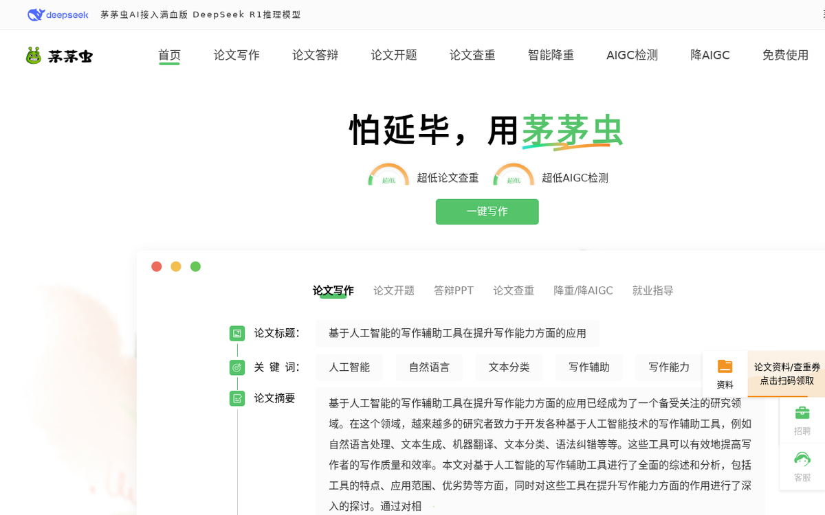 茅茅虫AI是由湖南茅茅虫科技有限公司(成立于2022年3月)开发的智能论文写作助手,总部位于长沙岳麓山国家大学科技城 。平台依托自研MMC-20B垂直学术模型及超五亿篇中文论文、过亿篇英文论文的私有化数据库构建,核心解决学术写作痛点 。2025年,平台接入满血版DeepSeek R1推理模型,进一步提升文本分析与逻辑生成能力 。功能覆盖选题分析、文献综述、开题报告、AI写作、分段查重、降AI率检测、答辩PPT及答辩文稿生成等全流程 。2024年11月完成阿尔法公社千万级Pre-A轮融资,累计服务数百万大学生客户 。平台愿景为“见证每一个人的破茧成蝶”,以区块链技术保障数据安全 。