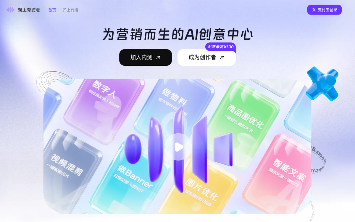 蚂上有创意是支付宝于2024年12月推出的AI创意生成平台,面向商家机构及设计师群体开放,聚焦于用AI让商业营销更简单。其核心是将AI技术深度融入支付宝商业生态,基于大数据+AIGC技术架构,为商家提供从创意素材生成到营销效果洞察的全链路解决方案。截至推出时,平台已累计为生态商家机构生成8700万张AI素材,覆盖近70个业务场景。蚂上有创意深度适配支付宝小程序、商家页面和推送消息的规格要求,生成的营销海报、商品图可直接用于支付宝店铺装修和营销活动,旨在帮助中小商家零门槛实现专业级视觉营销,提升投放转化率。