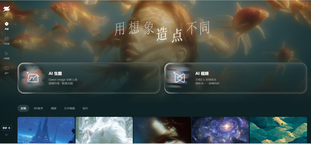 - AI图像生成(Midjourney V7):接入全球领先的Midjourney V7模型,支持多图参考、风格代码、精细化参数调节(风格化/怪异化/多元化滑块),在亚洲人像、中文文字生成及国风元素方面表现突出。