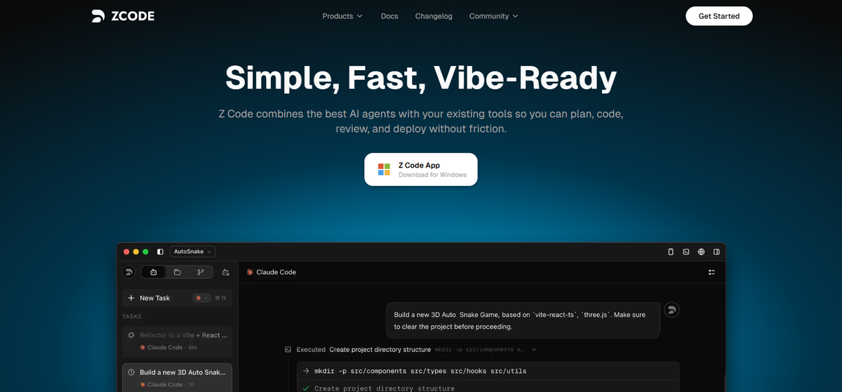 Z Code是智谱AI推出的轻量级AI代码编辑器(ADE),旨在解决命令行AI编程工具(如Claude Code、Codex、Gemini等)操作门槛高的问题 。其核心定位是从CLI工具的图形化界面逐步进化为多Agent协作的Vibe Coding平台,通过统一的可视化桌面将多个顶级Agent的能力无缝集成 。用户仅需一个API密钥即可丝滑切换体验Claude Code、Codex、Gemini等多款Agent编程工具,通过自然语言对话驱动其完成编码、分析等任务 。平台提供安全的文件版本管理、精细的权限控制、内置Agents机制以及MCP协议管理等一系列特性,旨在为开发者打造一站式、低门槛的AI辅助开发体验 。